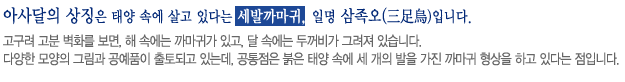 까마귀의 발이 왜 두 개가 아니라 세 개일까 하는 궁금증이 생길 것입니다. 원래 우리 민족이 '3'이라는 숫자를 유난히 좋아했기 때문일 수도 있겠지만, 태양 속에 흑점을 자세히 관찰하면 마치 세 발 달린 까마귀 모양을 하고 있다는 것을 알 수 있습니다. 이점에서 세발까마귀는 태양 흑점을 발견한 고대 우리 선조들의 과학정신의 상징이기도 합니다.