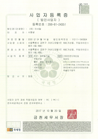 * 제목 : (주)아사달 사업자등록증 * 등록번호 : 206-81-24351