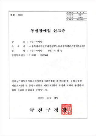 * 제목 : 통신판매업 신고증 * 신고일 : 2002년 6월 14일