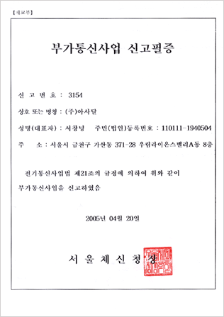전기통신사업법 제21조의 규정에 의하여 부가통신사업 신고.