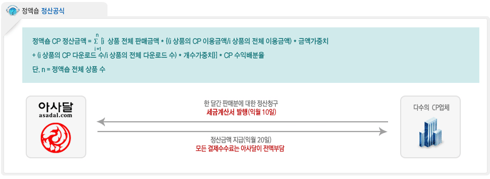 청구. 콘텐츠 판매 정산수수료는 익월 20일에 ㈜아사달이 CP업체의 통장으로 일괄 입금.